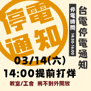 【03/14停電 提前休息通知】03/14(六) 14:00提前打烊